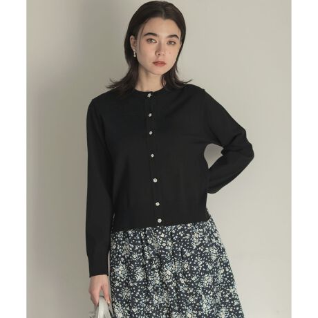 ■デザイン・小さな襟とコンパクトな着丈がシックでモダンなカーディガン。・首や肩が美しく見える絶妙なサイズ感にこだわりました。・様々なデザインのビジューボタンをアソートすることで、シンプルなデザインのスパイスに。・脇のスリットが抜け感と腰回りを自然にカバーしてくれるのも嬉しいポイント。・レイヤードアイテムとの相性が良く、特にフリルシャツコンビインナーとの合わせはおすすめです。・ボタンを全て留めてプルオーバーのように着るのもおすすめ。・適度に生地の厚さがあるのでダルっとせず好バランスがつくれ、コーディネート次第で様々な表情をみせてくれます。