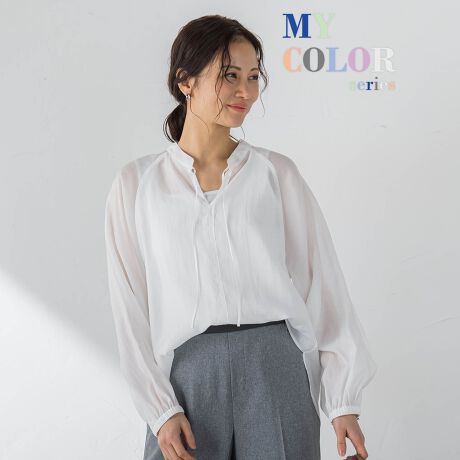 上品な抜け感を纏う、シアーバンドカラーブラウス。