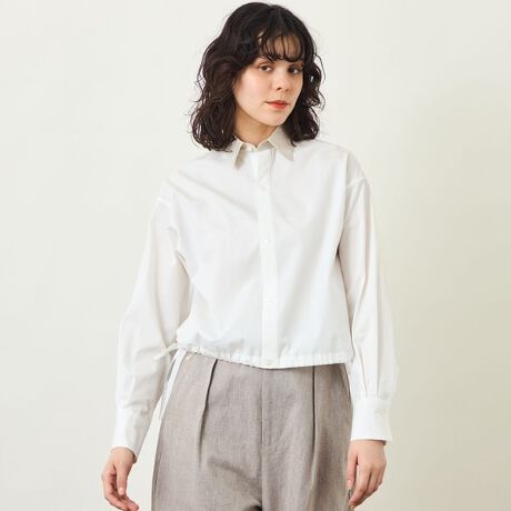 サイドリボンがデザインアクセントのクロップドシャツ。短めの丈なのでデザイントップスとしてチャレンジしやすいアイテムです。サイドリボンを絞った着方に加え、リボンを垂らしてもどちらもバランス良く着ていただけます。