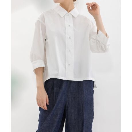 大きめの衿と太い前立て、カーブした袖口と無骨さを感じるディテールながら、どこかレディライクなレトロ感漂うおしゃれなシャツです。背中にはスワン刺繍のワンポイント入り。ボタンは共布のくるみボタンで、開けた時にちらりと見える配色ステッチもさりげないアクセント。