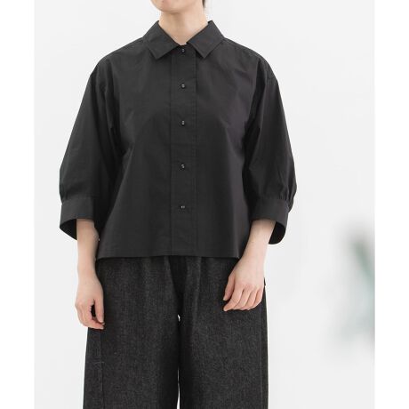 大きめの衿と太い前立て、カーブした袖口と無骨さを感じるディテールながら、どこかレディライクなレトロ感漂うおしゃれなシャツです。背中にはスワン刺繍のワンポイント入り。ボタンは共布のくるみボタンで、開けた時にちらりと見える配色ステッチもさりげないアクセント。
