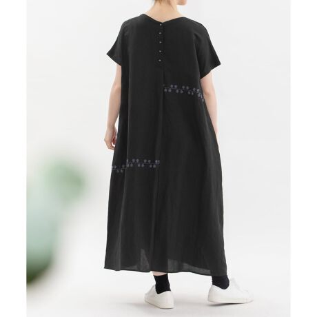 張りと落ち感に微光沢があり、カジュアルにもきれいめにも活躍するリネンレーヨン素材を使用したワンピース。ぐるぐるとした葉っぱや枝のようなライン刺繍を、アシメトリーの切り替えでモード感をプラスしました。前後どちらでも着用可能なAラインのノーカラーワンピースです。
