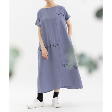張りと落ち感に微光沢があり、カジュアルにもきれいめにも活躍するリネンレーヨン素材を使用したワンピース。ぐるぐるとした葉っぱや枝のようなライン刺繍を、アシメトリーの切り替えでモード感をプラスしました。前後どちらでも着用可能なAラインのノーカラーワンピースです。