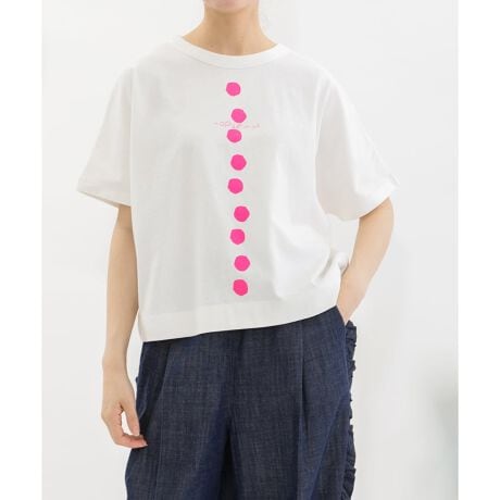 「よれない」「透けない」「長持ちする」良質なUSコットンに、歪なドットを縦に並べた柄を前後にプリントしたTシャツ。身頃続きの袖の抜け感が人気のシルエットです。太めのバインダー衿がアクセント。