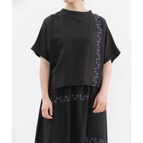 張りと落ち感に微光沢があり、カジュアルにもきれいめにも活躍するリネンレーヨン素材を使用したトップス。ぐるぐるとした葉っぱや枝のようなライン刺繍を、アシンメトリーにあしらいました。身頃続きのドルマンスリーブで、1枚ではもちろんレイヤードベストとしても着用可能。前後どちらでも着られる2way仕様で、夏の羽織としても活躍します。