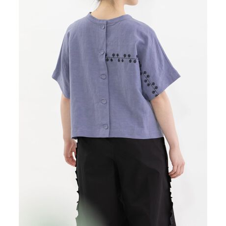 張りと落ち感に微光沢があり、カジュアルにもきれいめにも活躍するリネンレーヨン素材を使用したトップス。ぐるぐるとした葉っぱや枝のようなライン刺繍を、アシンメトリーにあしらいました。身頃続きのドルマンスリーブで、1枚ではもちろんレイヤードベストとしても着用可能。前後どちらでも着られる2way仕様で、夏の羽織としても活躍します。