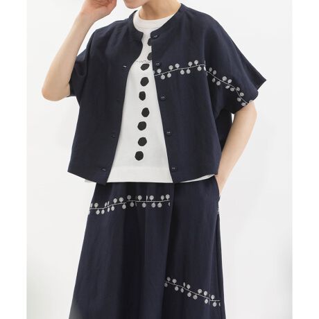 張りと落ち感に微光沢があり、カジュアルにもきれいめにも活躍するリネンレーヨン素材を使用したトップス。ぐるぐるとした葉っぱや枝のようなライン刺繍を、アシンメトリーにあしらいました。身頃続きのドルマンスリーブで、1枚ではもちろんレイヤードベストとしても着用可能。前後どちらでも着られる2way仕様で、夏の羽織としても活躍します。