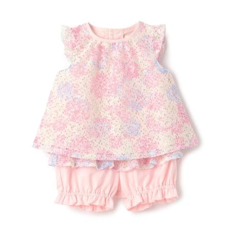 あじさい柄の華やかなレーストップスにカットソーパンツを合わせたベビースーツです。