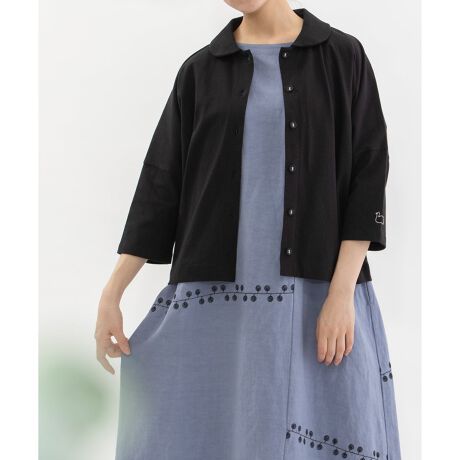 USAコットンの空紡糸天竺を使用したカットソー。ドルマンスリーブの抜け感あるシルエットと、丸衿デザインがポイントです。ブラウスのような感覚で着られ、トップスとしてはもちろん、フルオープンで軽い羽織としても活躍します。左袖には、ピンクのステッチで刺繍を施してポイントになっています。