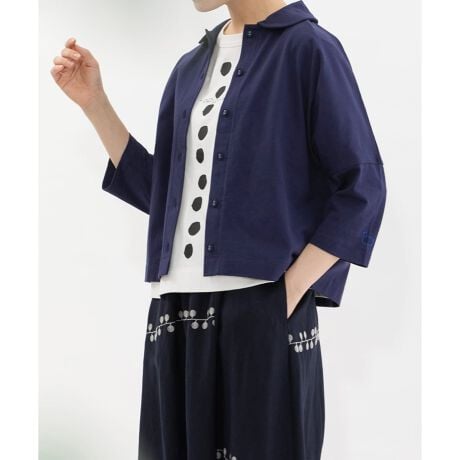 USAコットンの空紡糸天竺を使用したカットソー。ドルマンスリーブの抜け感あるシルエットと、丸衿デザインがポイントです。ブラウスのような感覚で着られ、トップスとしてはもちろん、フルオープンで軽い羽織としても活躍します。左袖には、ピンクのステッチで刺繍を施してポイントになっています。