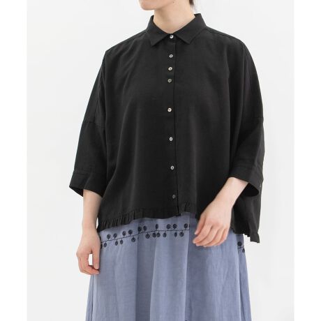 裾にフリルをあしらったクロップドシャツ。しっかりと厚みのあるリネンレーヨン素材を使用し、存在感があり、羽織としても使える一枚です。ワイドなスクエアシルエットで、サイドが自然に垂れるこなれたフォルム。短め丈ながらバランスがよく、人気のシルエットに仕上げました。上部のみボタン間隔を狭くしたデザインがアクセントです。開けた時にちらりと見える配色ステッチもさりげないポイントです。