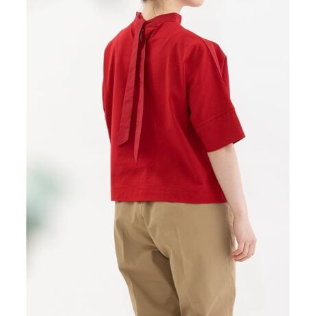 前身頃に布帛生地、後ろ身頃にはUSAコットンを使用したブラウス見えするデザイントップス。後ろボータイのトレンド感ある仕様で、リボン結びはもちろんラフに結んで垂らす着こなしもおすすめです。身頃続きのドルマンスリーブで、ゆとりがありながら品よく着られる人気のシルエット。袖口はカットソー素材で、折り返しも可能です。ラフな着心地と、ブラウスのようなきちんと感を兼ね備えた一枚です。