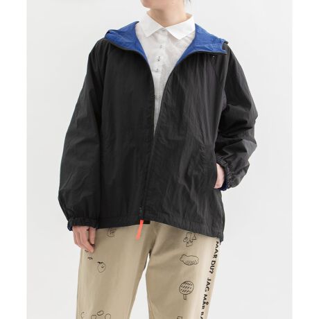 軽量ナイロンタフタ生地のリバーシブルパーカ。表はシンプルな無地、裏は配色ライン入りのスリーブデザイン。撥水加工付きで、軽い雨の日も安心です。片面の背中にスワンネームが入り、フード着用時のポイントに。