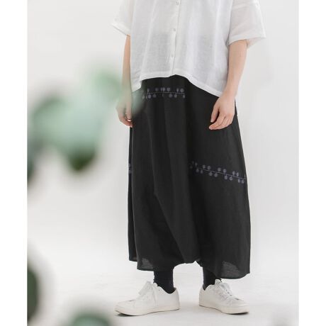 張りと落ち感に微光沢があり、カジュアルにもきれいめにも活躍するリネンレーヨン素材を使用したサルエルパンツ。ぐるぐるとした葉っぱや枝のようなライン刺繍を、アシメトリーの切り替えでモード感をプラスしました。ゆったりとラフな穿き心地ながら、こなれ感のあるおしゃれを叶えてくれるボトムです。ウエストはゴム仕様で内紐付き。両サイドポケットつき。