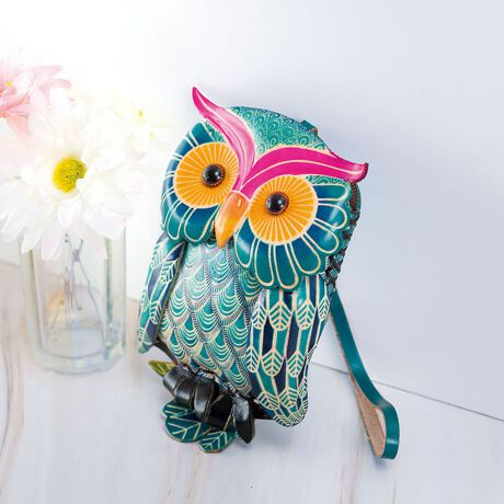 幸運の象徴「フクロウ」をモチーフにした、牛革仕立てのアートなポーチ。