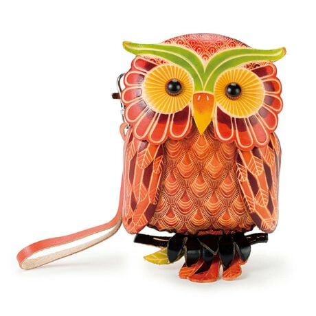 幸運の象徴「フクロウ」をモチーフにした、牛革仕立てのアートなポーチ。