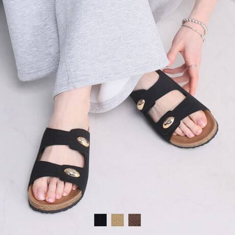 ・ぷっくりとした立体的なゴールドパーツが足元に映えるダブルベルトサンダル!