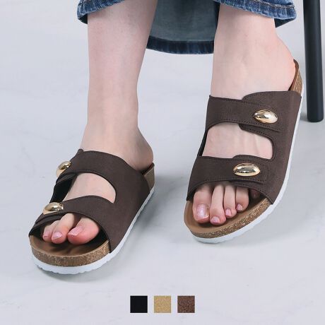 ・ぷっくりとした立体的なゴールドパーツが足元に映えるダブルベルトサンダル!