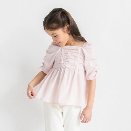 肩から袖口にかけて通したゴムが、ポコポコとした立体的なギャザーを作り出し、ふんわりとしたボリューム袖を形作ります