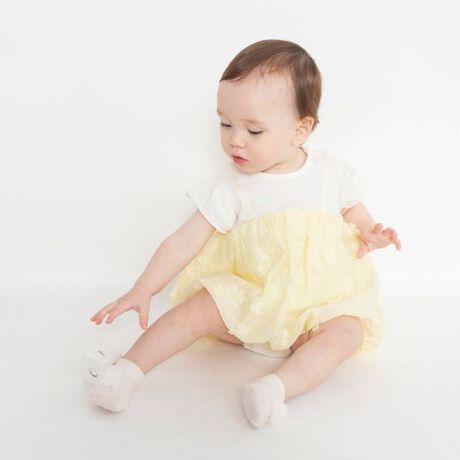 全体に散りばめられた大きなお花が、ベビーの愛らしさを最大限に引き立てる主役級のデザイン