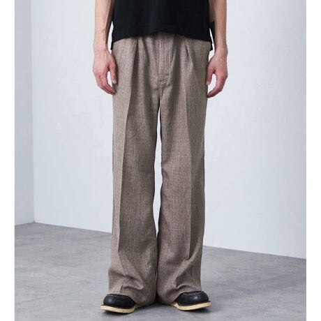 太さがランダムな糸で織り上げられた、リネンライクなファブリックを採用しています。上品な落ち感がありながらも、肌離れが良く、清涼感のある穿き心地が特徴です。