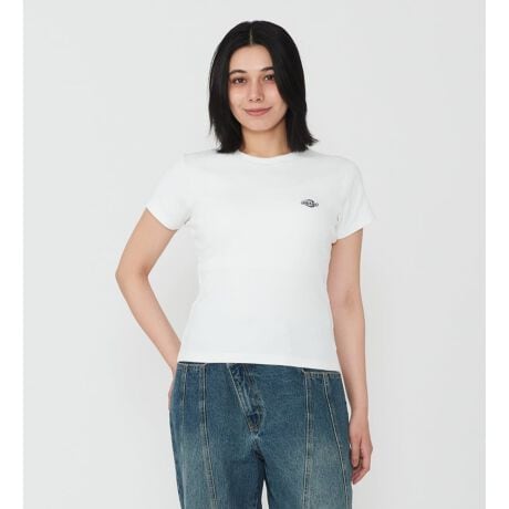綿をベースに、ポリウレタンを混紡したリブ素材を使用し、左胸にワンポイントの刺繍を施した、シンプルなTシャツ。