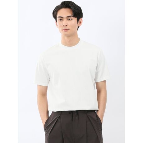 ジャケットの衿が汚れにくい、後ろ衿巾を高くしたスロープネックの半袖Tシャツです。両サイドのスリットと裾部分の表地切り替えがポイント。綺麗目なインナーアイテムとしてジャケットインに最適な一枚です。プライベートからオフィスカジュアルまでオンオフ兼用で着回しが可能です。