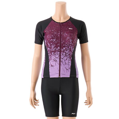 2way方向によく伸びる生地を使用。グラデーション柄のトップスはファスナー付で着脱が楽な袖付セパレーツ水着。カップは挿入カップ式。アンダー内側の15mmゴムが胸を固定し綺麗に見せます。体に沿った無地切替えとステッチの視覚効果でシャープな脇ライン。クイックジップ機能で楽にファスナーが上がります。ボトム前全面に伸びの良い裏地付。ウエストはスピンドル入りで調節可能。めくれ防止機能付。FILAロゴ刺繍入