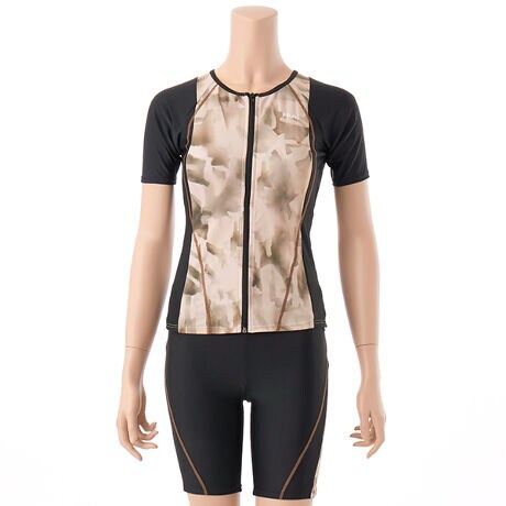 2WAY方向に伸びるトリコット生地。袖付きファスナー開きセパレーツ水着。体に沿った濃色の切り替えとステッチ効果でウエストや脇ラインを細くみせます。トップス胸とボトム裾にFILAロゴ刺繍入り。ファスナーを上げやすいようスナップボタンが付いたクイックジップ機能とTOPSの裾がめくれないめくれ防止機能付。カップは入れ替えできる差し込みタイプです。アンダー内側の15mmゴムが胸を固定し胸を綺麗に見せます。