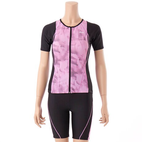 2WAY方向に伸びるトリコット生地。袖付きファスナー開きセパレーツ水着。体に沿った濃色の切り替えとステッチ効果でウエストや脇ラインを細くみせます。トップス胸とボトム裾にFILAロゴ刺繍入り。ファスナーを上げやすいようスナップボタンが付いたクイックジップ機能とTOPSの裾がめくれないめくれ防止機能付。カップは入れ替えできる差し込みタイプです。アンダー内側の15mmゴムが胸を固定し胸を綺麗に見せます。