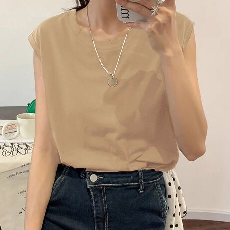 腕が露出している分、バランスをとるために首元はやや詰まったクルーネックデザインに