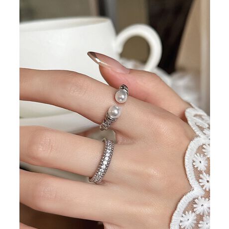 上品なパールときらめくストーンが魅力の、2点セットのオープンリング。