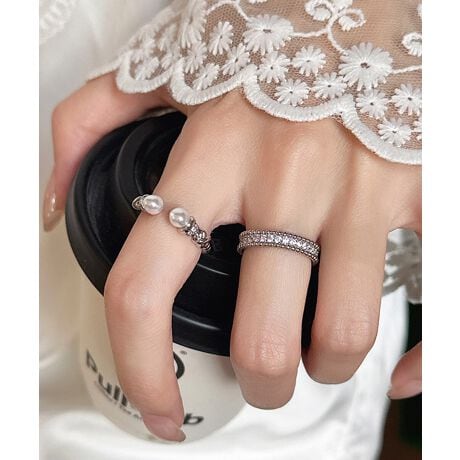 上品なパールときらめくストーンが魅力の、2点セットのオープンリング。