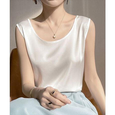 光沢感のあるなめらかなサテン風生地を使用した、ノースリーブのUネックタンクトップ。
