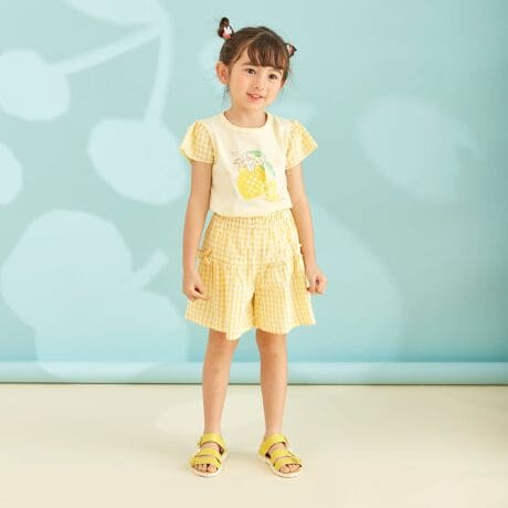 胸にmimiちゃんとフルーツモチーフのプリントをあしらったTシャツと、チェックのキュロットのセット。