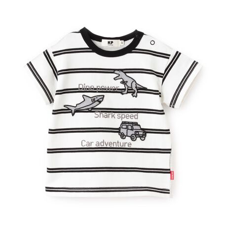 大きなピッチのボーダーが爽やかな1枚。お子さんの大好きな恐竜や車のモチーフが、アクセントになっています。同系色でまとめているので、デニムはもちろん、カラーボトムとも好相性。公園遊びやお出掛け、通園通学コーデにも採り入れやすいアイテムです。