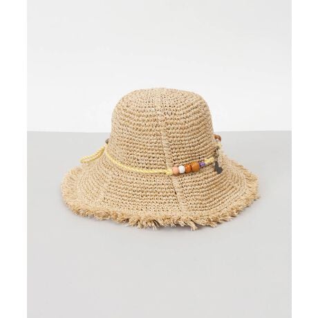 つば先がフリンジになった手編みの中つば天然ハットです。腰の飾りコードにバタフライモチーフのビーズとウッドビーズを使いナチュラルで可愛らしく仕上げました。取り外しができてドローコードとしても使えます。