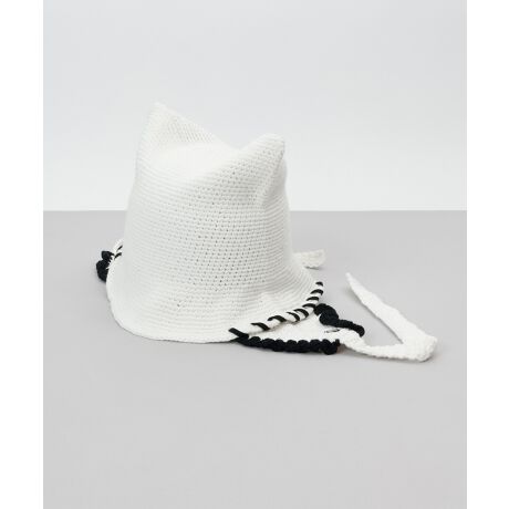被るとネコ耳になるシルエットの手編みニットクロッシェハットです。サイドの耳当て部分にはフリルをあしらいガーリーなイメージに仕上げています。