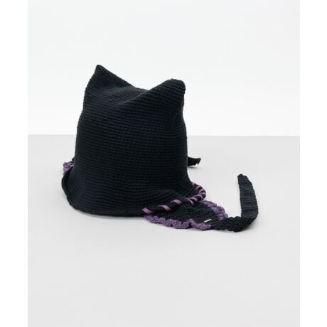 被るとネコ耳になるシルエットの手編みニットクロッシェハットです。サイドの耳当て部分にはフリルをあしらいガーリーなイメージに仕上げています。