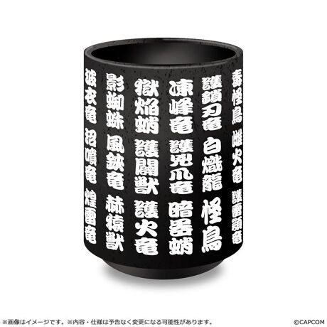 「鎖刃竜」(アルシュベルド)、「煌雷竜」(レ・ダウ)、「獄焔蛸」(ヌ・エグドラ)など、『モンスターハンターワイルズ』に登場するモンスターの漢字名を、寿司屋の湯呑み風にデザインした「漢字名湯呑み」です。
