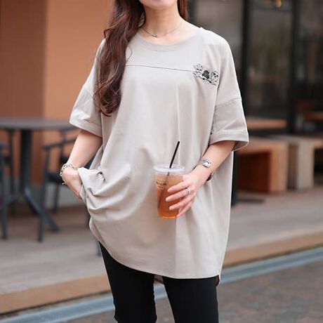 前も後ろも、思わず見たくなる。さりげなく可愛いアニマルプリントが魅力のデザインTシャツ。左胸ポケット部分には、ちょこんと並んだ犬と猫。背中側にはその“うしろ姿”が描かれ、前後でストーリーがつながる遊び心あるデザインです。さらに背中中央にはカラフルなボタンを縦にあしらい、視線を上げながら縦ラインを強調。ゆったりシルエットなのに、すっきり見えに♪