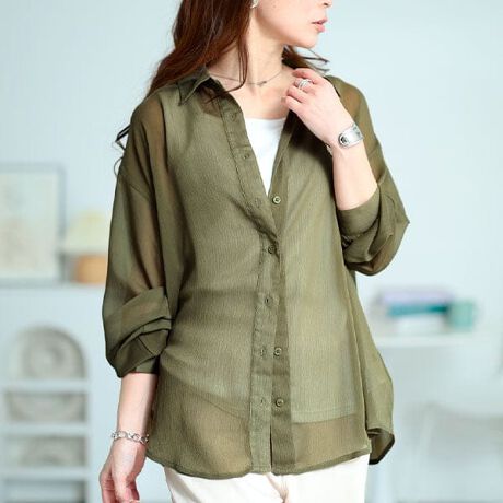 人気のシアーシャツにミドル丈が新登場。軽やかな透け感が魅力のワッシャーシアールーズシャツです。デイリーに取り入れやすいベーシックデザイン。裾に向かって自然に広がるAラインシルエットが腰まわりやヒップラインをカバー。シワ感のあるワッシャー加工が無地でも奥行きをつくってくれます。カジュアルコーデからきれいめカジュアルに仕上げる着回し力も魅力。日差し対策、冷房対策にも活躍してくれるので、持っておきたいアイテム。定番ポジションとしてワードローブに加えたくなる一枚です。