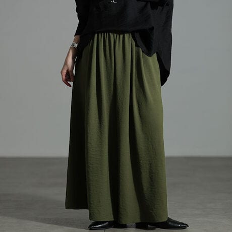 とろみ感と光沢感のあるテクスチャーが、揺れ動く度に美しいドレープを描く、キュロットパンツ。まるでスカートのようなシルエットが女性らしさを演出しながらも、安心のパンツ型だから、アクティブな動きにも対応します。ひんやりタッチな生地だから、これからも季節にぴったり。満足感のあるたっぷりのワイド幅レングスだから、穿くだけで下半身を丸ごと体型カバー。幅広なウエストゴムがメリハリを生み、しっかりウエストマーク。デザイン性のあるゴムだから、インコーデもサマ見えに。落ち感のあるテクスチャーだから、ワイド幅でもすっきり見えに。