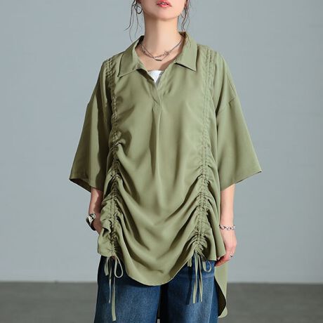フロントの両サイドにドローコードが配され、好みのシルエットに変化させられるデザイン性あるシャツ。シンプルながらも、オーバーサイズのシルエットのラフさが、トレンド感を演出します。着こなしやすい定番のブラックに、ニュアンスカラーが大人スタイルを盛り上げます。ゆったりとしたサイジングでボディラインを拾うことなく、着るだけで体型カバーしながら、垢抜けスタイルが完成。ドローコードを絞れば、すっきりとした印象に。フラットの状態でも、モード感が加速します。長めの袖や裾丈で、気になる部分もさり気なくカバーする頼れる一着。