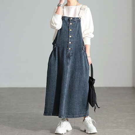 ストリートやボーイッシュな着こなしに映えるコットンデニムサロペットスカート。縦ラインを意識したIラインフォルムで、全体をすっきり見せ。程よく広がるシルエットがヒップや太もものラインを自然にカバー。大きく開いたサイドの抜けデザインや後ろのスリットがロング丈でも軽やかな印象。素材は綿100%の程よい厚みのデニム生地で、着るほどになじむ風合いが魅力。ベーシックなデニムとはひと味違う、配色デザインで差がつく存在感をぜひ体感してください。