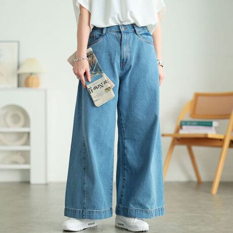 ラフに洒落るコットンデニムルーズワイドパンツ登場☆気になるヒップライン&脚のラインを拾わないワイドフレアシルエットで体型カバー◎ボリュームのあるシルエットでコーデのバランスが取りやすい♪脇の三角切り替えでルーズシルエットなのにスッキリ脚長見せ◎通年穿ける綿100%コットンデニム生地で穿く度に馴染む!