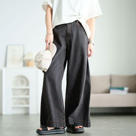 ラフに洒落るコットンデニムルーズワイドパンツ登場☆気になるヒップライン&脚のラインを拾わないワイドフレアシルエットで体型カバー◎ボリュームのあるシルエットでコーデのバランスが取りやすい♪脇の三角切り替えでルーズシルエットなのにスッキリ脚長見せ◎通年穿ける綿100%コットンデニム生地で穿く度に馴染む!