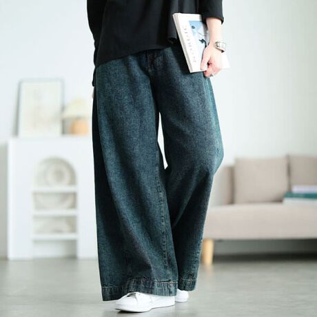 ラフに洒落るコットンデニムルーズワイドパンツ登場☆気になるヒップライン&脚のラインを拾わないワイドフレアシルエットで体型カバー◎ボリュームのあるシルエットでコーデのバランスが取りやすい♪脇の三角切り替えでルーズシルエットなのにスッキリ脚長見せ◎通年穿ける綿100%コットンデニム生地で穿く度に馴染む!