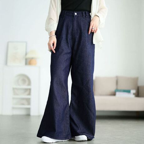 軽やかに穿きこなすコットンスラブデニムフレアワイドパンツ登場☆気になるヒップライン&脚のラインを拾わないワイドフレアシルエットで体型カバー◎ボリュームのあるシルエットでコーデのバランスが取りやすい♪薄手デニムなので蒸し暑い季節にも快適に穿きこなせる◎シルエットにもゆとりがあるので風が通り蒸し暑さを軽減してくれます♪