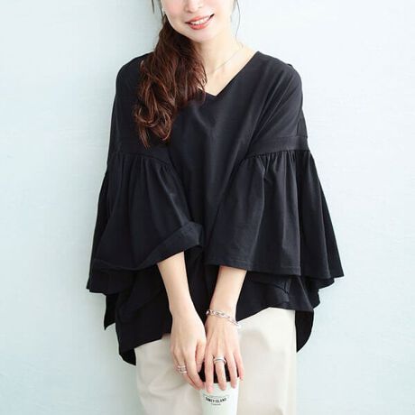 ニュアンシーな落ち感纏う、ギャザーフレアスリーブコットンプルオーバーすっぽり体型が隠れるゆったりシルエットでぽっちゃり体型なかったことに!自然に脚長見えする前後差着丈で気になるヒップラインもしっかりカバー◎ドロップショルダーから贅沢に広がるフレアスリーブで華やかに二の腕を隠してくれる♪好みのボトムスに合わせるだけで日常〜お出かけまで大活躍☆